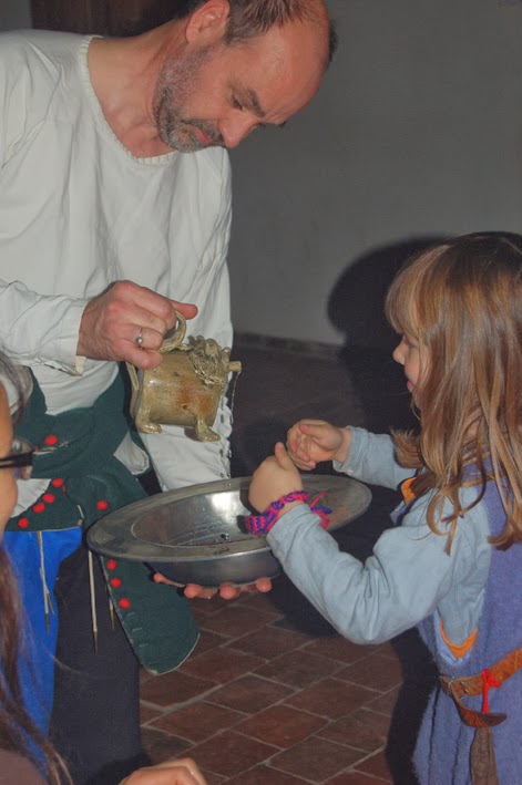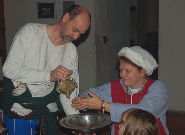 And of course we (do have table manners and) used it at our dinner in the castle hall of Castle Loevestein a few weeks ago. In the 'Mesnagier de Paris', a 14th century cook- and housekeeping book, a description is given for the water used to wash the hands: