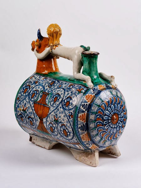 Late medieval / early renaissance aquamanile from Pesaro, Italy and dated 1490-1500. Tin-glazed earthenware, painted with colours. Height: 41.5 cm, Length: 36 cm - twice as large compared to the other ewers.