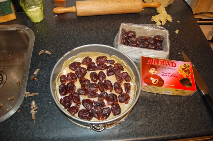 Divide the second third of the dough in half and add the pieces of dough that remained from the first third. Roll one piece into a thin circle that will fit into the tart. Cut of the excess pieces of the dough. Sprinkle with sugar and cloves and press them into the dough. Place this on top of the walnuts. Half the dates, remove the pit and arrange them on top of this layer of dough. I preferably use Iranian sun dried dates, these are the best to use for the torta. Sprinkle the dates liberally with almond milk. Roll out the other small piece of dough (with the excess dough of the previous layer added) as before and place it on top of the dates.